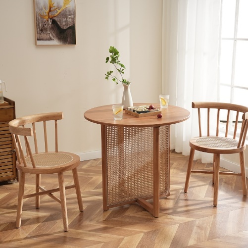 圆形桌面消解刻板,藤编围板如“透气网”,手工编织,更加结实耐用,实木框架纤细外扩,靠三角力学稳立,半包围藤编,3000+透气微孔藏纳杂志、遥控器,围合高度30cm贴合膝盖,随手取物更便捷,实用隐于细节,桌面精选优质实木材质(可定制木材) ,可选樱桃木(暖调温馨)、白蜡木(清新自然)等,其适用场景广泛,多用于餐厅,书房,卧室,高端民宿等营造温馨用餐氛围,支持全品类定制。
